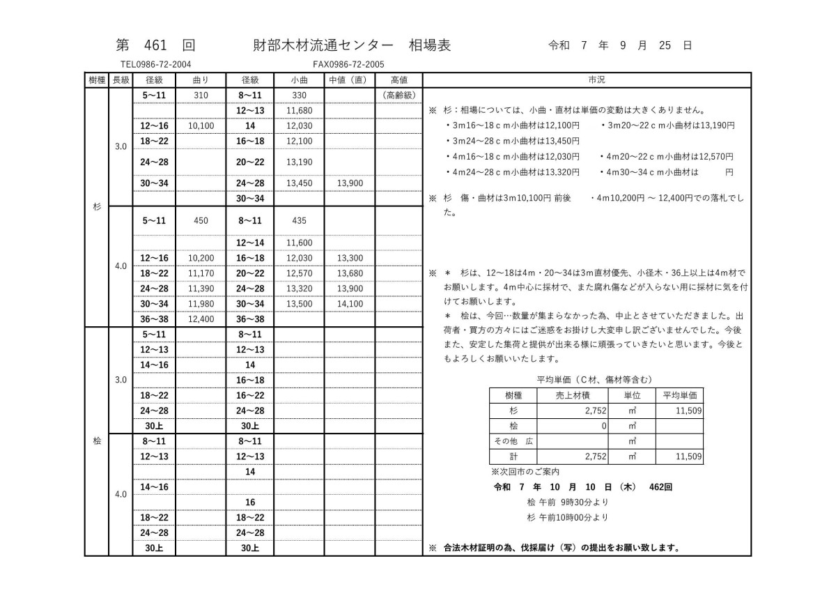 第461回 令和7年9月25日市 相場表を更新しました。 2025年10月7日 曽於市森林組合 > お知らせ > 第461回 令和7年9月25日市 相場表を更新しました。 第461回 令和7年9月25日市