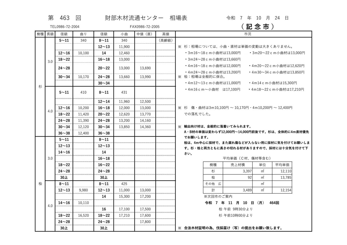 第463回 令和7年10月24日市 相場表を更新しました。 2025年10月30日 曽於市森林組合 > お知らせ > 第463回 令和7年10月24日市 相場表を更新しました。 第463回 令和7年10月24日市
