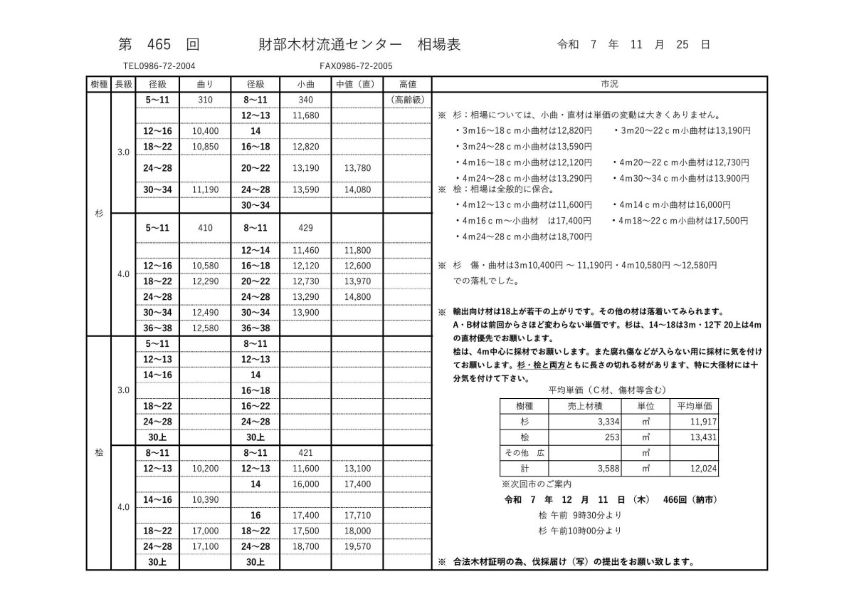 第465回 令和7年11月25日市 相場表を更新しました。 2025年12月1日 曽於市森林組合 > お知らせ > 第465回 令和7年11月25日市 相場表を更新しました。 第465回 令和7年11月25日市