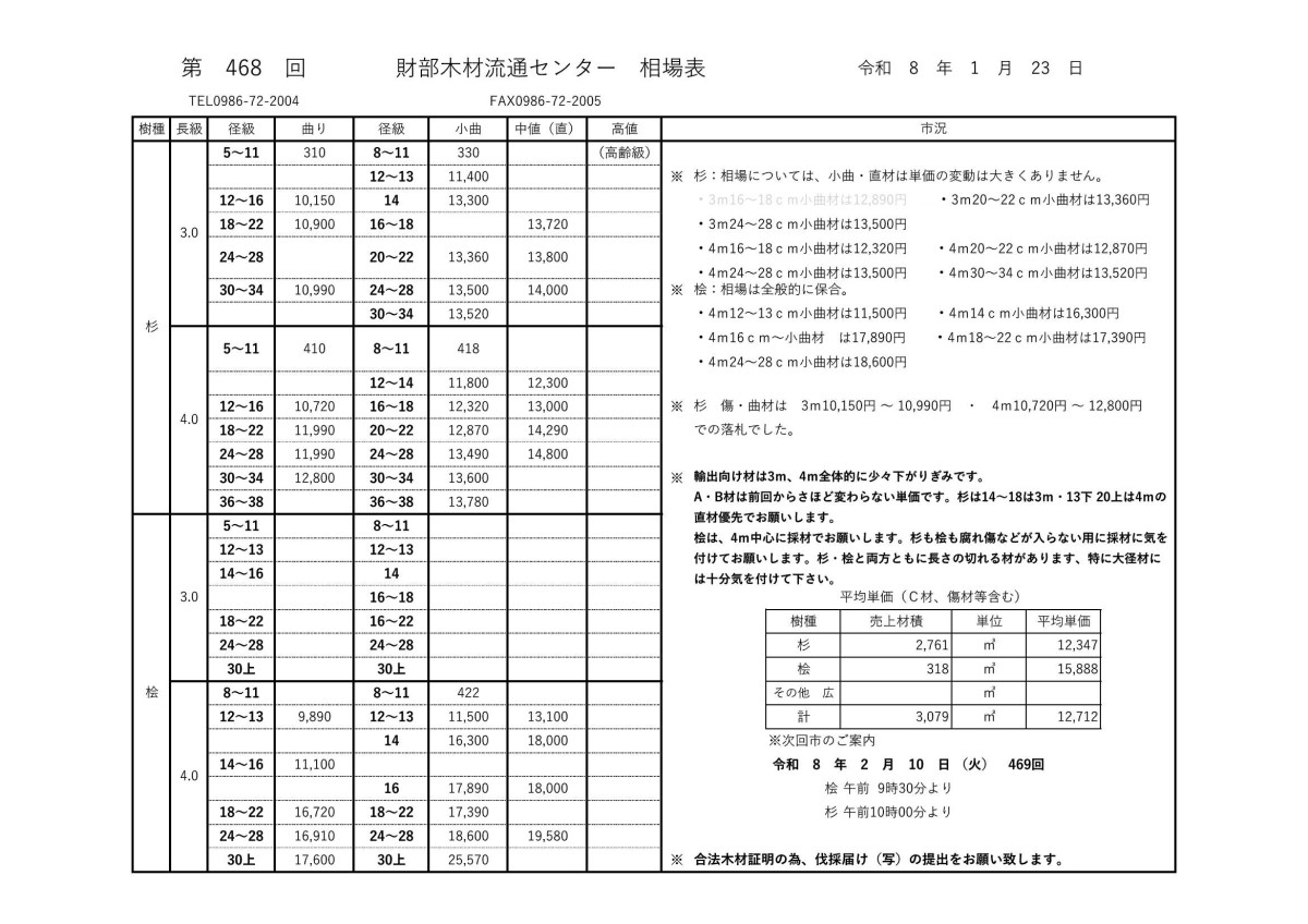 第468回 令和8年1月23日市 相場表を更新しました。 2026年1月30日 曽於市森林組合 > お知らせ > 第468回 令和8年1月23日市 相場表を更新しました。 第468回 令和8年1月23日市